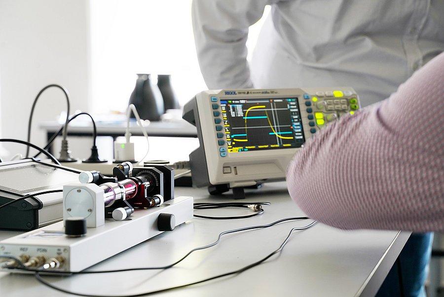 Der über ein Online-Buchungssystem bestellbare Koffer „Experimentallaser“ besteht aus einem Hauptkoffer mit dem Festkörperlaser sowie zwei Nebenkoffern mit Zubehör (Digitaloszilloskop und -spektrometer) und einem Laptop. Zu den Experimenten, die mit dieser Ausstattung durchgeführt werden können, gehören u. a. die Messung der Fluoreszenz des Rubin-Kristalls, der Fluoreszenzlebensdauer sowie der Laserleistung im Vergleich zur Pumpleistung. „Wie man durch Bestrahlung eines Rubinkristalls mit blauem Licht diesen zu rotem Leuchten anregen kann, sieht man hier mit eigenen Augen. Den Schulen der Region ein solches Experiment anzubieten, ist unser Beitrag zum 100. Jubiläum der Quantenphysik in 2025“, so Grebe-Ellis über die Einsatzmöglichkeiten des Lasers im Physikunterricht.